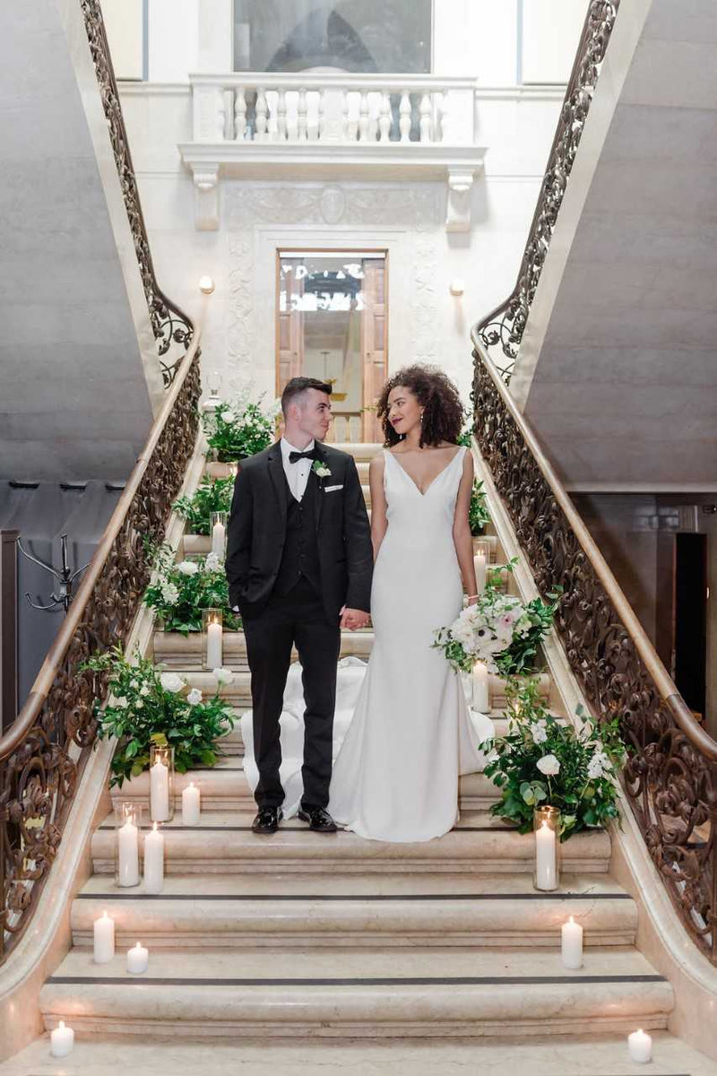Our gorgeous bride Emily stunned in Reem Acra at her Philly wedding to husband Colin. They got married at restaurant Harp & Crown and made sure it was a party with delicious food, drinks, and sweets! Check out the entire feature here to get more photos and details from their big day!